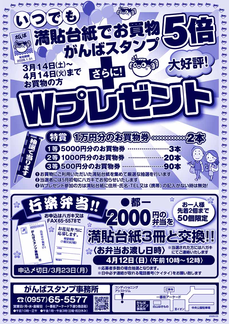 | ハガキまたはFAXでご応募ください。締め切り3/23 〒855-0806 長崎県島原市中堀町17-1 がんばスタンプ事務所あて FAX 0957-65-5578 行楽弁当:希望個数(1個or2個)/お名前/ご住所/電話番号(ケイタイ) 日中必ず連絡が取れる住所/電話番号(ケイタイ)をお願いします。不備の場合無効になります。 応募者多数の場合、抽選になります。当選者には、後日ハガキで連絡いたします。 |