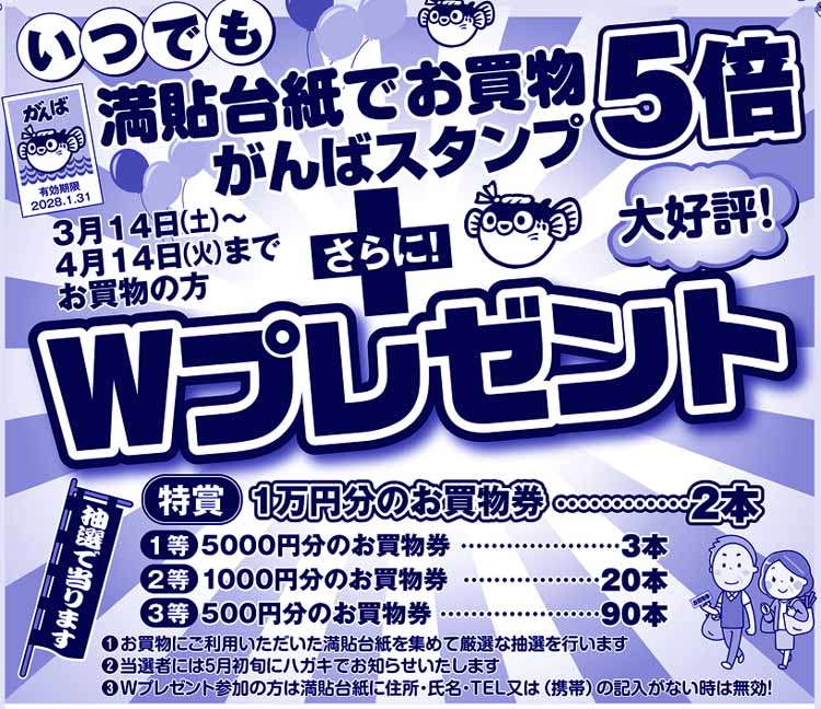 | 特賞:1万円分のお買い物券 2本! 1等:5千円分のお買い物券 3本! 2等:千円分のお買い物券 20本! 3等:5百円分のお買い物券 90本! 当選者には5月初旬にハガキでお知らせさいたします。 満貼台紙の住所氏名電話(ケイタイ)の記入をお忘れなく! |