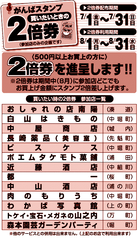 | 参加店で500円以上のお買い物の方へ! 買いたい時の「2倍券」を進呈! お渡し期間:7/1(金)〜7/31(日) (2倍券利用期間:8/1(月)〜8/31(水) |