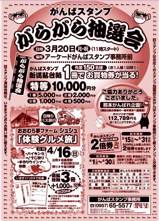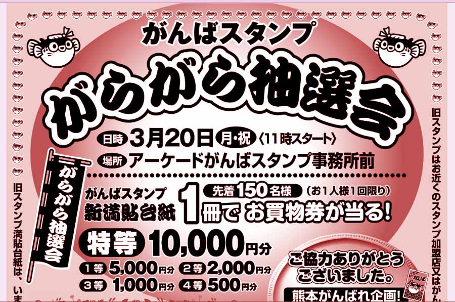 | 3月20日(月・祝)午前11時〜 アーケードがんばスタンプ事務所前 お一人様一回!新・満貼台紙(250枚)一冊!先着150名様! 特等:一万円のお買い物券! |