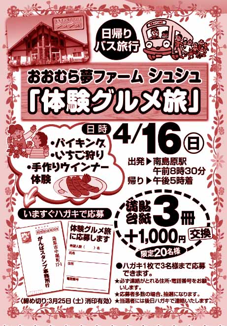 | *「官製はがき」でご応募下さい。(3/25消印有効) 満貼台紙3冊+1,000円と交換 *20名様限定 4/16(日)am8:30出発 pm5時着 おおむら夢ファーム シュシュ http://www.chouchou.co.jp/ バイキング!イチゴ狩り!手作りウインナー体験! |