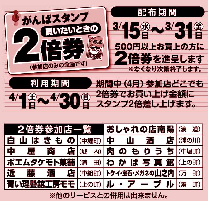 | 参加店で500円以上のお買い物の方へ! 買いたい時の「2倍券」を進呈! お渡し期間:3/15(水)〜3/31(金) (2倍券利用期間:4/1(土)〜4/30(日) |