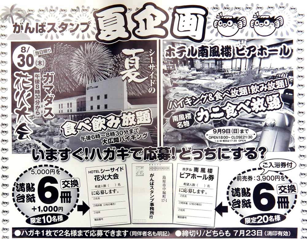 | *「官製はがき」でご応募下さい。(7/23消印有効) ************************* ☆ ホテルシーサイド島原 ☆ https://www.seaside-shimabara.com/ 8/30(木)18:00〜20:30 花火大会 満貼台紙6冊+1,000円と交換 *10名様限定 ************************* ☆ ホテル南風楼 ☆ http://www.nampuro.com/ 9/9(日)まで 18:00〜21:30 満貼台紙6冊と交換 *20名様限定 |