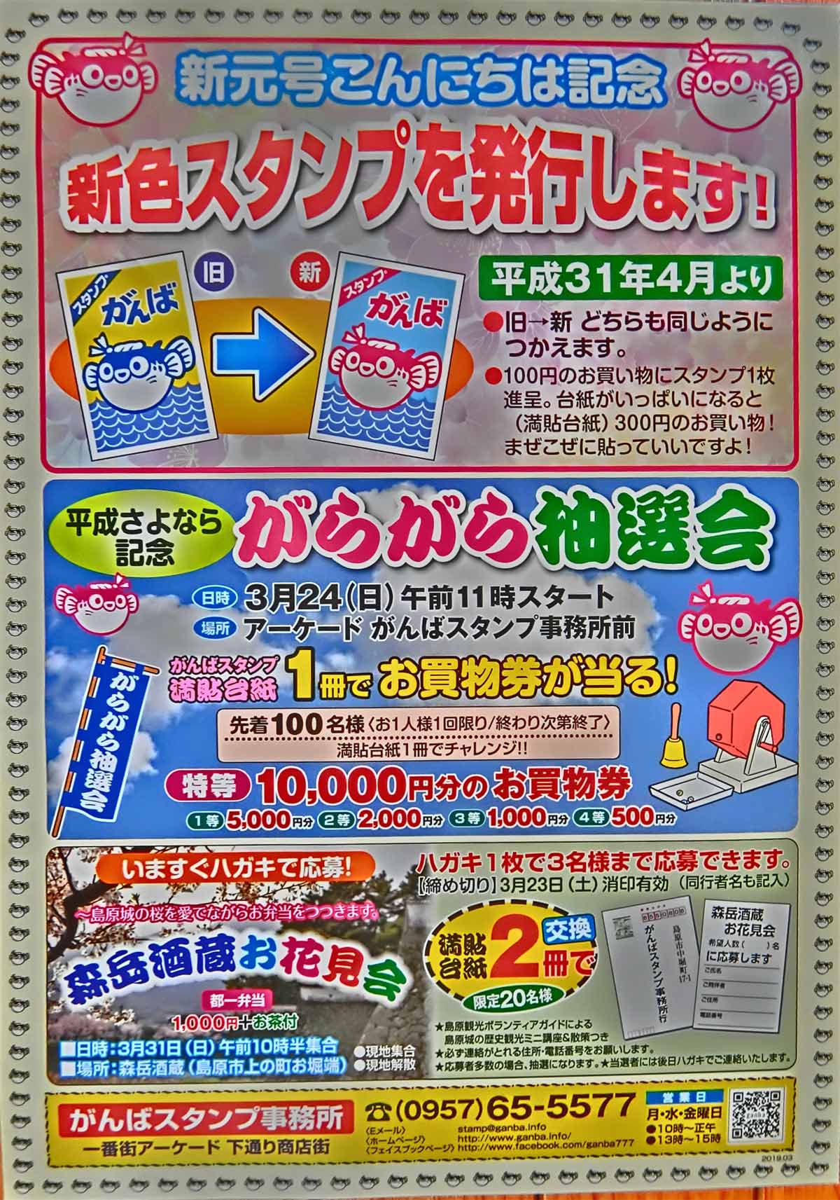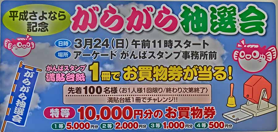 | 3月24日(日)午前11時〜 アーケードがんばスタンプ事務所前 お一人様一回!満貼台紙(250枚)一冊!先着100名様! 特等:一万円のお買い物券! |