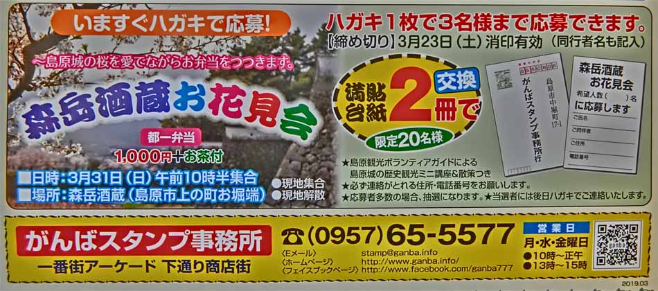 | *「官製はがき」でご応募下さい。(3/23消印有効) 満貼台紙2冊! 20名様! 3/31(日)am10時30分集合 森岳酒蔵(島原市上の町897) http://www.city.shimabara.lg.jp/page2954.html お花見弁当(都一1000円)+お茶 |
