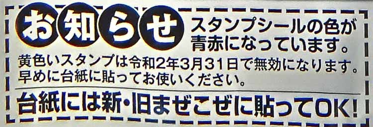 | 旧「黄色シール」は (新・旧まぜこぜに貼った満貼台紙も) 「令和2年(2020年)3月31日」まで! ☆ 新「青色シール」は 「令和6年(2024年)3月31日」まで! |