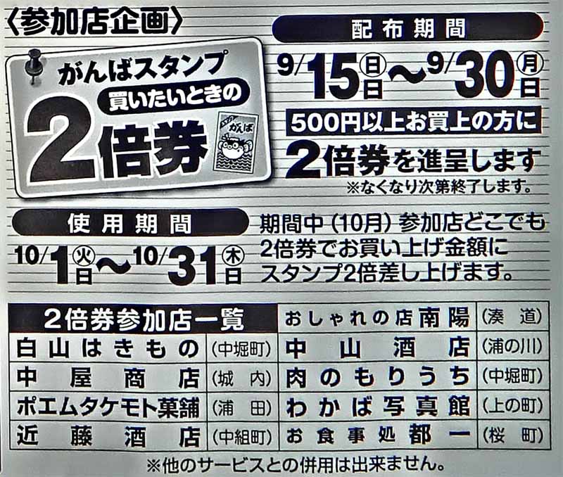 | 買いたい時の2倍券!プレゼント!(参加店のみの企画) 参加店で500円以上のお買い物の方へ! 買いたい時の「2倍券」を進呈! お渡し期間:9/15(日)〜9/30(月) (2倍券利用期間:10/1(火)〜10/31(木) |