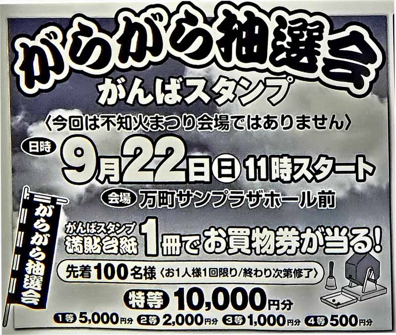 | 9月22日(日)午前11時〜 アーケード万町サンプラザホール前 お一人様一回!満貼台紙(250枚)一冊!先着100名様! 特等:一万円のお買い物券! |