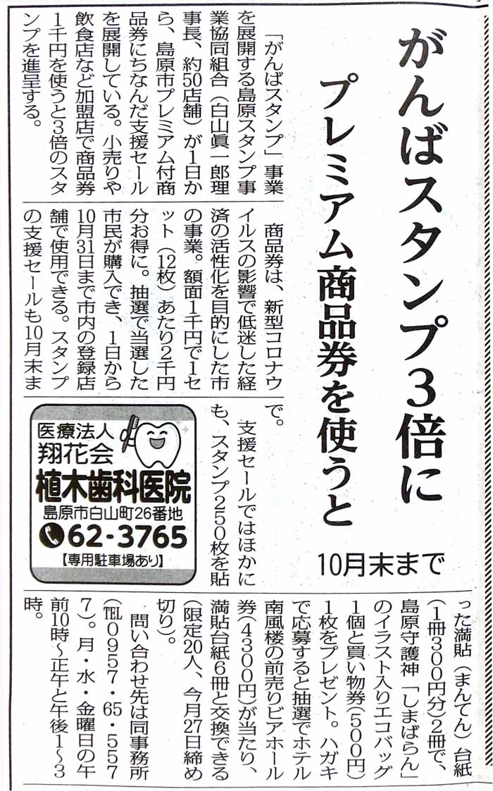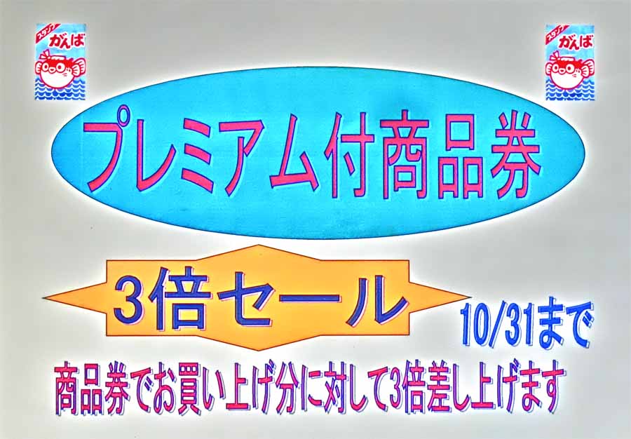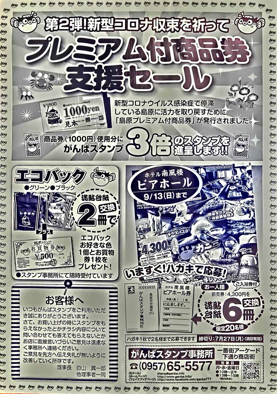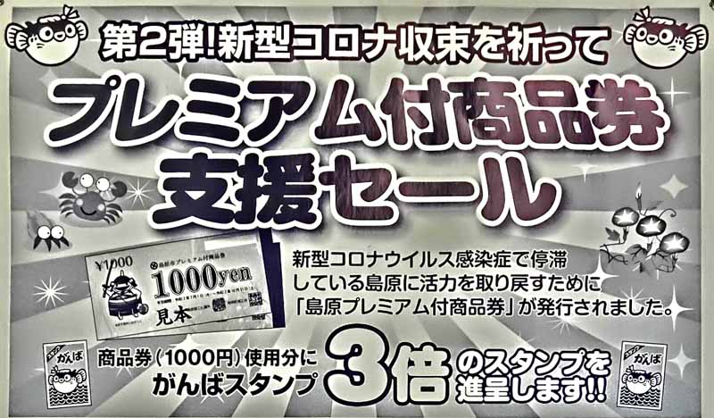 | 島原市プレミアム付き商品券 商品券でお買い上げ分に対し がんばスタンプ3倍セール! 7/1〜10/31 |