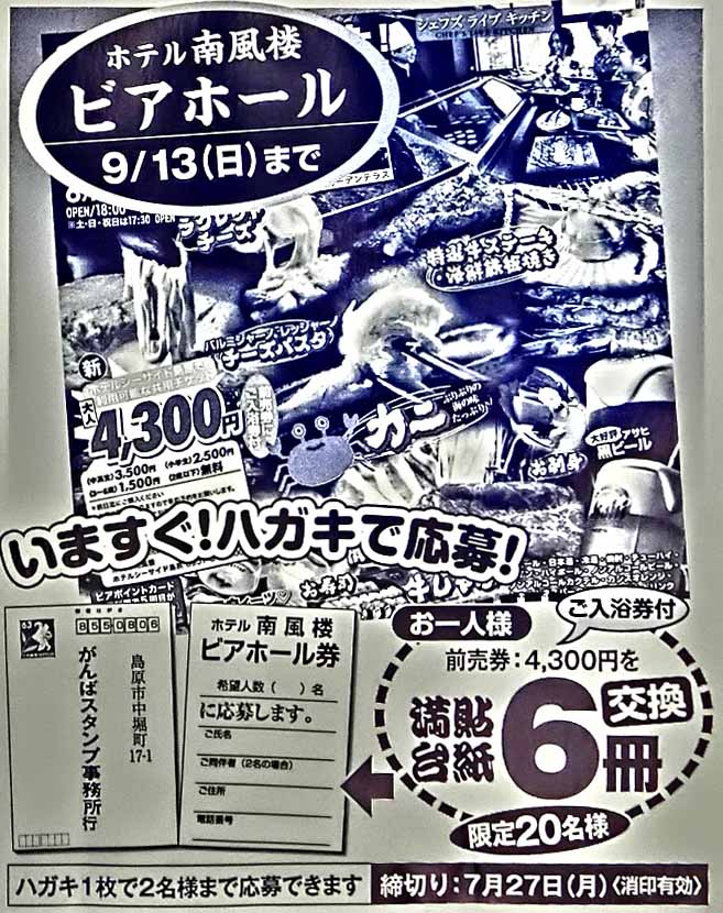 | *「官製はがき」でご応募下さい。(7/27消印有効) *ハガキ1枚で、2名様まで応募できます! ☆南風楼ビアホール!(前売券4,300円)入浴券付 満貼台紙6冊! 20名様! 9/13(日)まで!pm6時〜9時 ビアホールバイキング(120分) ホテル南風楼(島原市弁天町2-7331-1) https://www.nampuro.com/ |