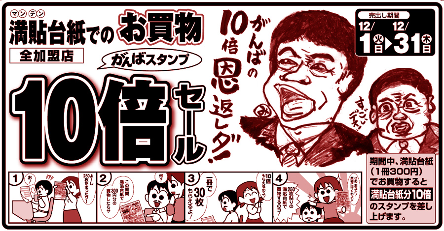 | 12/1(火)〜12/31(木)の売り出し期間中! 満貼台紙(1冊300円)でお買い物すると 「満点台紙分10倍」のスタンプを差し上げます! |
