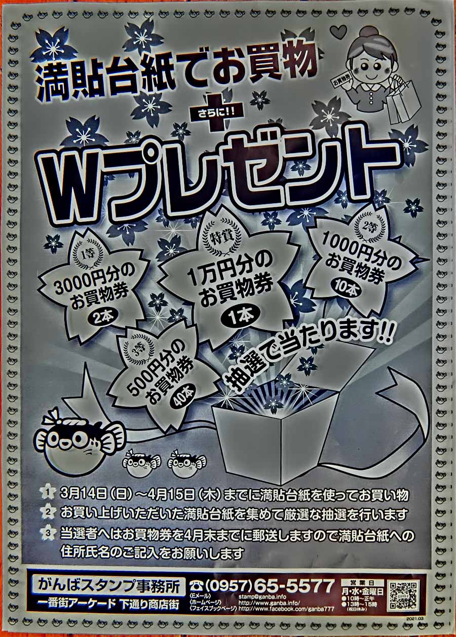 | 特賞1万円分のお買い物券 1本! 1等3千円分のお買い物券 2本! 2等千円分のお買い物券 10本! 3等5百円分のお買い物券 40本! 当選者さまには4月末までにお買い物券を郵送させていただきます。 満貼台紙の住所氏名の記入をお忘れなく! コロナ禍での密を避ける為、ガラガラ抽選会の替わりに、 満貼台紙での抽選となりました。ご了承ください。m(__)m |