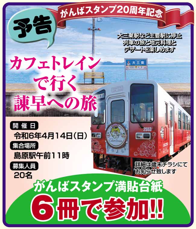 | 4/14(日)11:00 島原駅 20名様 満貼台紙6冊または3冊+2000円 ハガキ(FAX)で4名様まで応募できます。応募〆切12/27消印有効 応募者が10名に満たない場合は企画が中止となります。 |