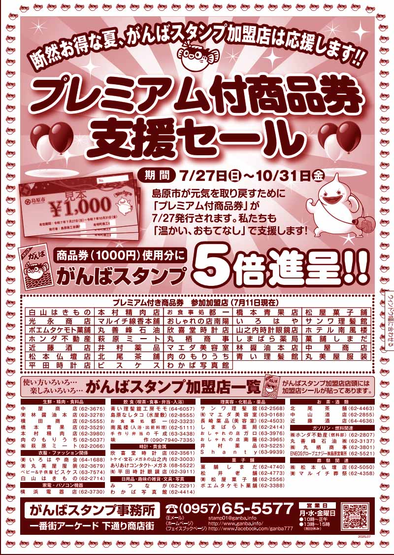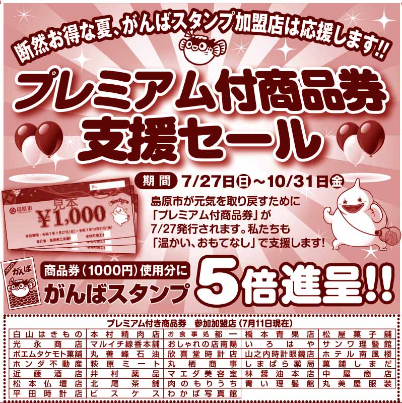 | ☆島原市プレミアム付商品券支援セール☆ がんばスタンプ5倍進呈 |