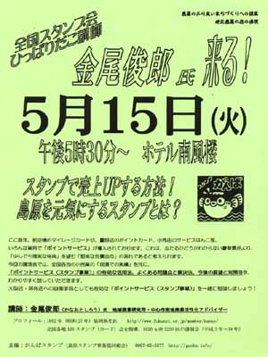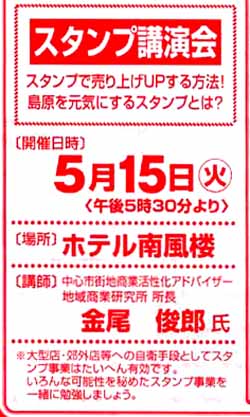 | 全国スタンプ会ひっぱりだこ講師 金尾俊郎氏来る! 5/15(火) 午後5時30分〜 ホテル南風楼 スタンプで売上UPする方法! 島原を元気にするスタンプとは? |