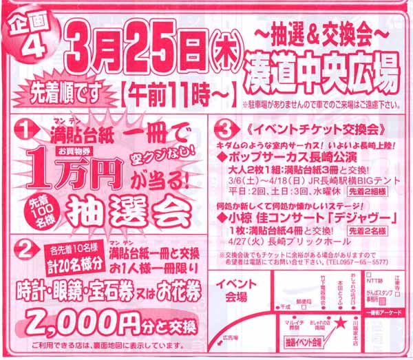 | イベント参加券交換会 *交換受付時間 10:30〜11:00 受付人数が、用意したチケット数を超えた場合は抽選になります。 ・ポップサーカス長崎公演(2組)=1組(2名様):満貼台紙3冊 完売! 3/6(土)〜4/18(日)平日:2回、土日:3回、水曜休、 JR長崎駅横ポートアリーナBIGテント ・小椋佳コンサート「デジャヴー」(2名様)=1名:満貼台紙4冊 4/27(火)午後7時〜長崎ブリックホール *交換会後でも、チケットに余裕がある場合がありますので ご希望の方は電話で問い合わせてみてください。 がんばスタンプ事務所=0957−65−5577 |