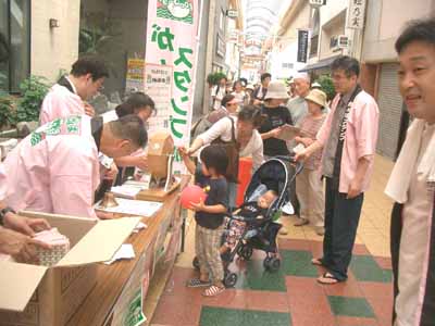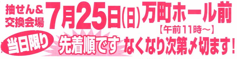 | 7月25日(日)抽選会 午前11時〜 中部地区:万町ホール前 *駐車場がありませんので車でのご来場はご遠慮下さい。 |