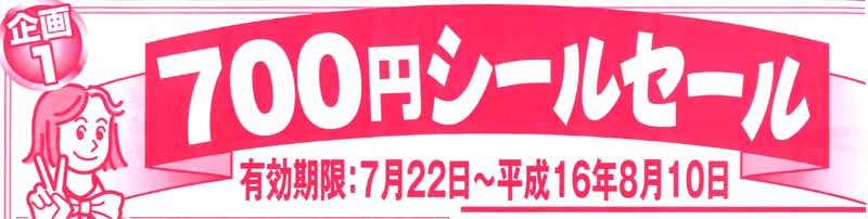 | 700円シールセール 7/22折込チラシに「700円シール(2枚)」を印刷 満貼台紙に「700円シール」を貼ると、700円のお買い物ができますヨ! (有効期限8月10日) |