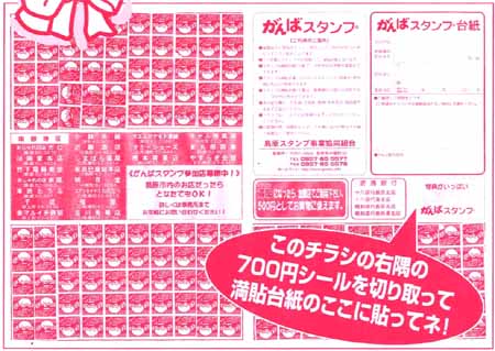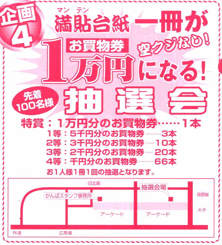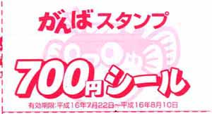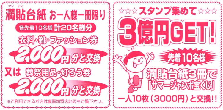 | 「サマージャンボWプレゼント」 「700円シールセール」で加盟店でお買い物をしたお客様の中から!3名様! 1等賞:100万円お買い上げ分スタンプシール! 1名様 2等賞: 50万円お買い上げ分スタンプシール! 2名様 |
