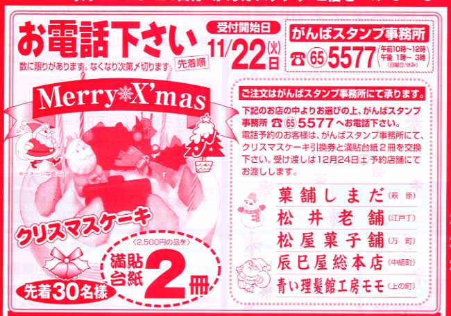 | お電話ください! がんばスタンプ事務所 0957−65−5577 (午前10時〜12時 午後1時〜3時 日曜休) *数に限りがありますので、無くなり次第、締め切ります。 |