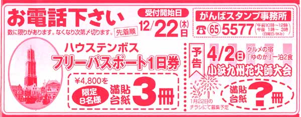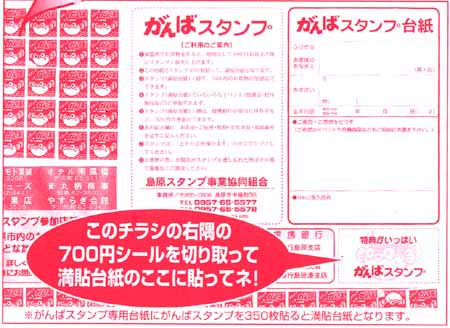 | お電話ください! がんばスタンプ事務所 0957−65−5577 (午前10時〜12時 午後1時〜3時 日曜休) *数に限りがありますので、無くなり次第、締め切ります。 |