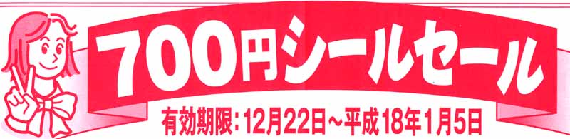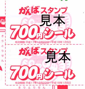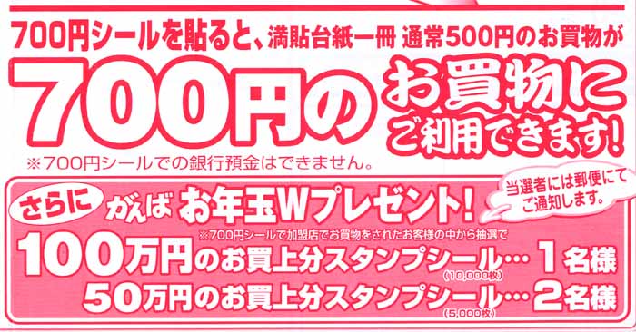 ![]() 12月チラシ(12/22新聞折込、又は加盟店にてGET!) 右上に「700円シール」が2枚付いてます。 切り取って ![]() がんばスタンプシールを350枚貼った「満貼台紙」の 上記の場所に貼ると、 通常「500円のお買い物に使える」のが 「700円のお買い物に使える」ようになります。 |