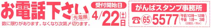 | お電話ください! がんばスタンプ事務所 0957−65−5577 (午前10時〜12時 午後1時〜3時 日曜休) *数に限りがありますので、無くなり次第、締め切ります。 |