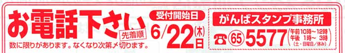 | お電話ください! がんばスタンプ事務所 0957−65−5577 (午前10時〜12時 午後1時〜3時 日曜休) *数に限りがありますので、無くなり次第、締め切ります。 |