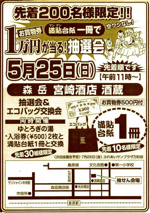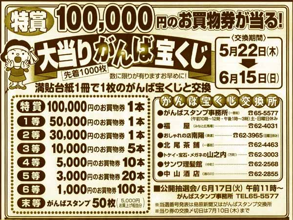 | 特賞:10万円=【272】 1等:5万円=【487】 2等:3万円=【525】 3等:1万円=【547】【548】【701】【782】【785】 4等:5千円=【09】下2桁 5等:3千円=【58】【98】下2桁 6等:千円=【1】下1桁 ハズレ=スタンプシール50枚(5000円買上分) 交換場所:がんばスタンプ事務所 (ハズレ交換は、がんばスタンプ加盟店でもOK) 交換締め切り:7/10 |
