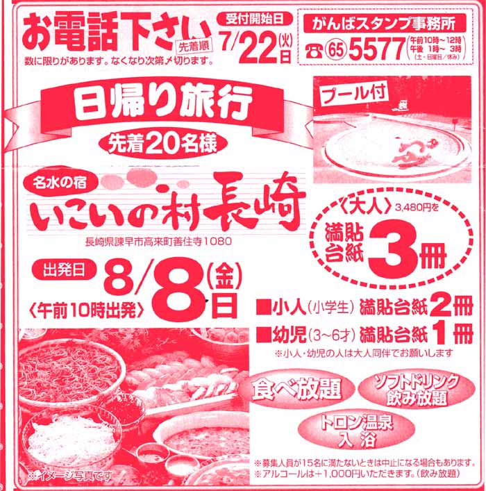 | お電話ください! がんばスタンプ事務所 0957−65−5577 (午前10時〜12時 午後1時〜3時 日曜休) *数に限りがありますので、無くなり次第、締め切ります。 |