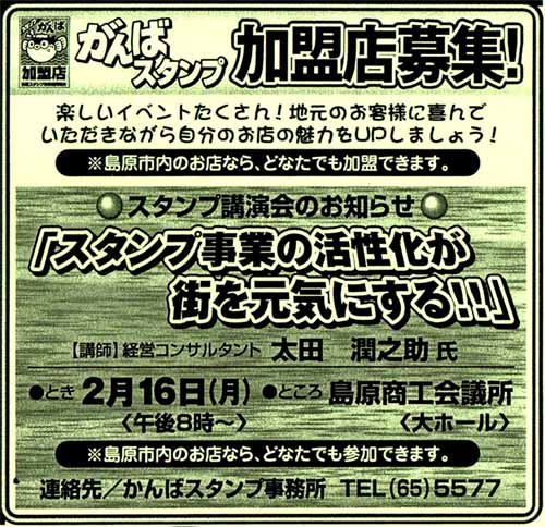 | お電話ください! がんばスタンプ事務所 0957−65−5577 (午前10時〜12時 午後1時〜3時 土・日曜休) *数に限りがありますので、無くなり次第、締め切ります。 |