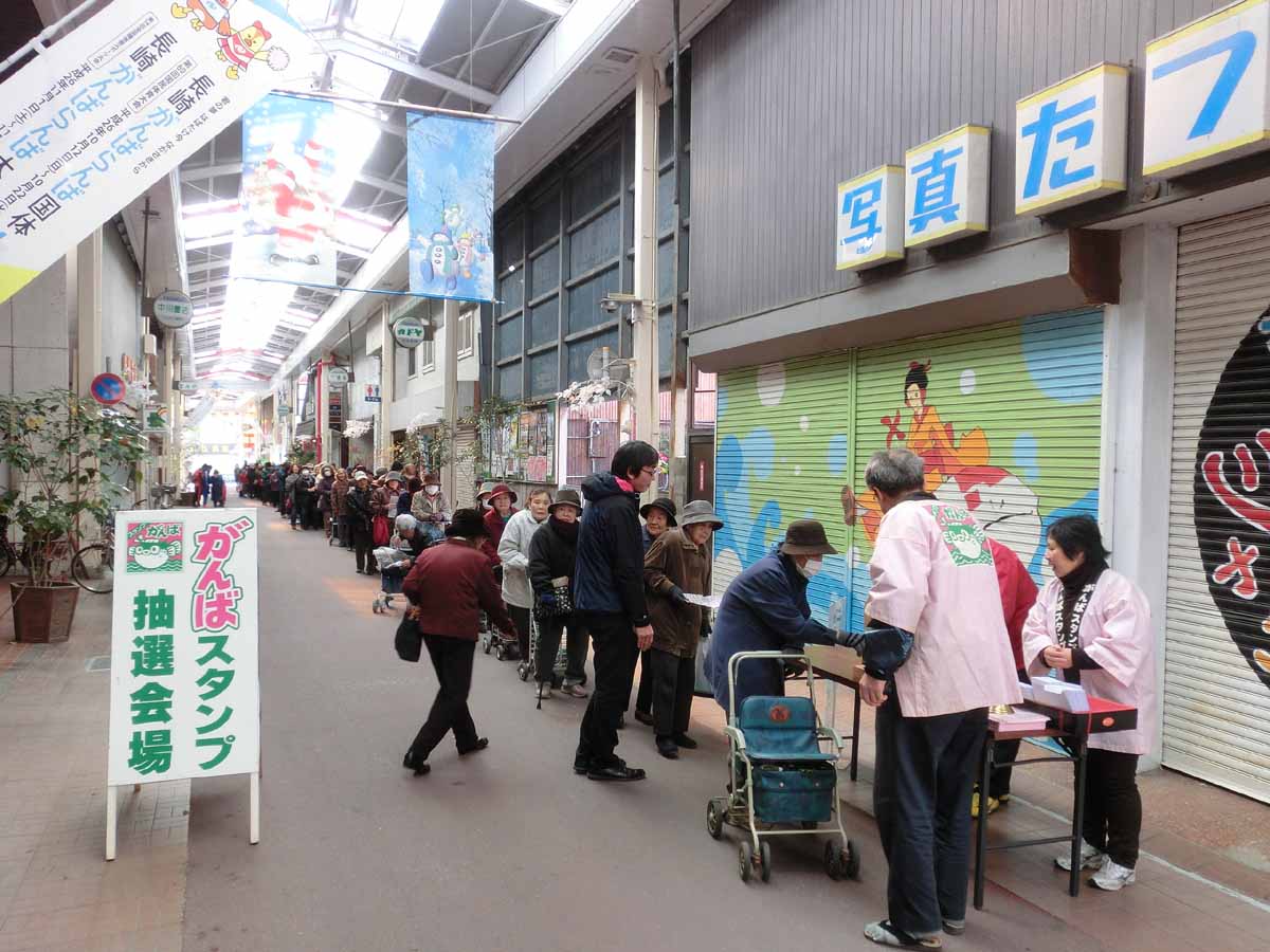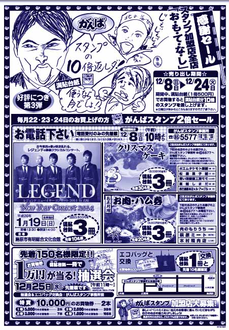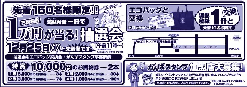 | 12月25日(水)午前11時〜がんばスタンプ事務所前 お一人様一回!満貼台紙一冊!先着順! 特等:一万円のお買い物券 一等:五千円のお買い物券 二等:三千円のお買い物券 末等:一千円のお買い物券 |