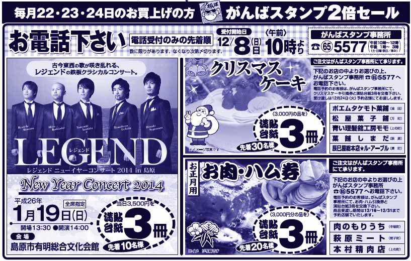 | 12月8日(日)午前10時〜電話受付開始 お電話ください!がんばスタンプ事務所 0957−65−5577 (午前10時〜12時 午後1時〜3時 休み:土・日曜・祝日) *数に限りがありますので、無くなり次第、締め切ります。 |