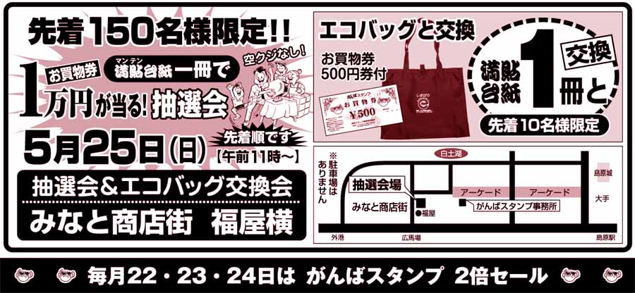 | 5月25日(日)午前11時〜 みなと広場場 福屋横 お一人様一回!満貼台紙一冊!先着150名様! 特等:一万円のお買い物券 一等:五千円のお買い物券 二等:三千円のお買い物券 末等:一千円のお買い物券 |