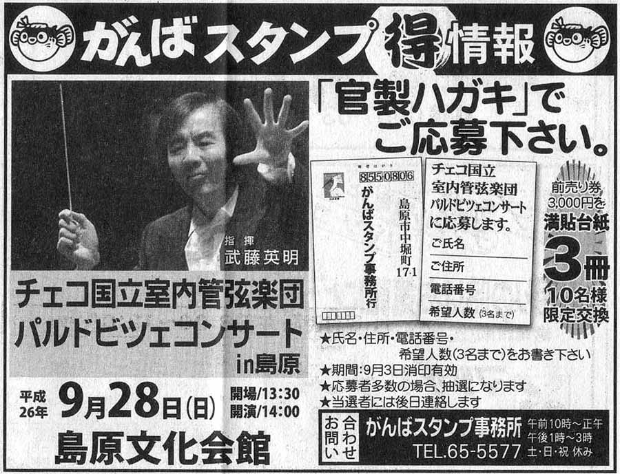 | 「チェコ国立室内管弦楽団パルドビツェコンサートin島原」 ◎日時:9月28日(日)開場13:30/開演14:00 ◎場所:島原文化会館 ◎全席指定:3,500円(前売3,000円) http://www.city.shimabara.lg.jp/life/pub/detail.aspx?c_id=34&id=1579 ☆がんばスタンプ:満貼台紙:3冊!限定10名様! ハガキにてご応募下さい。(9/3消印有効) |