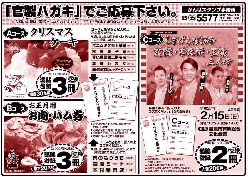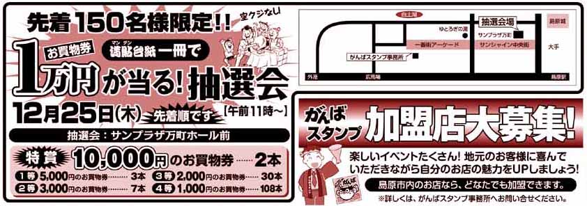 | 12月25日(木)午前11時〜 サンプラザ万町ホール前 お一人様一回!満貼台紙一冊!先着150名様! 特等:一万円のお買い物券! |