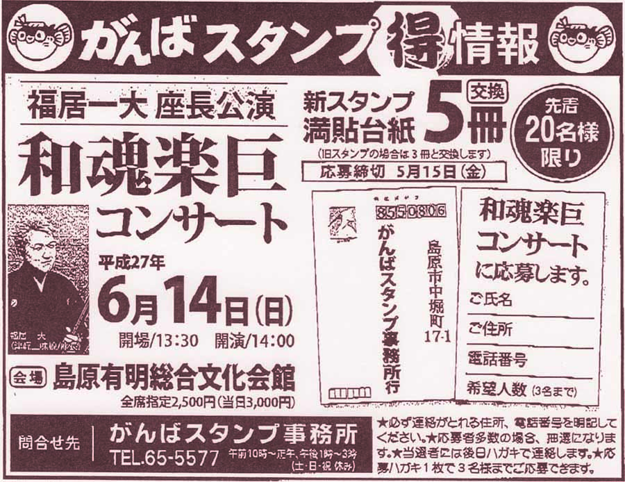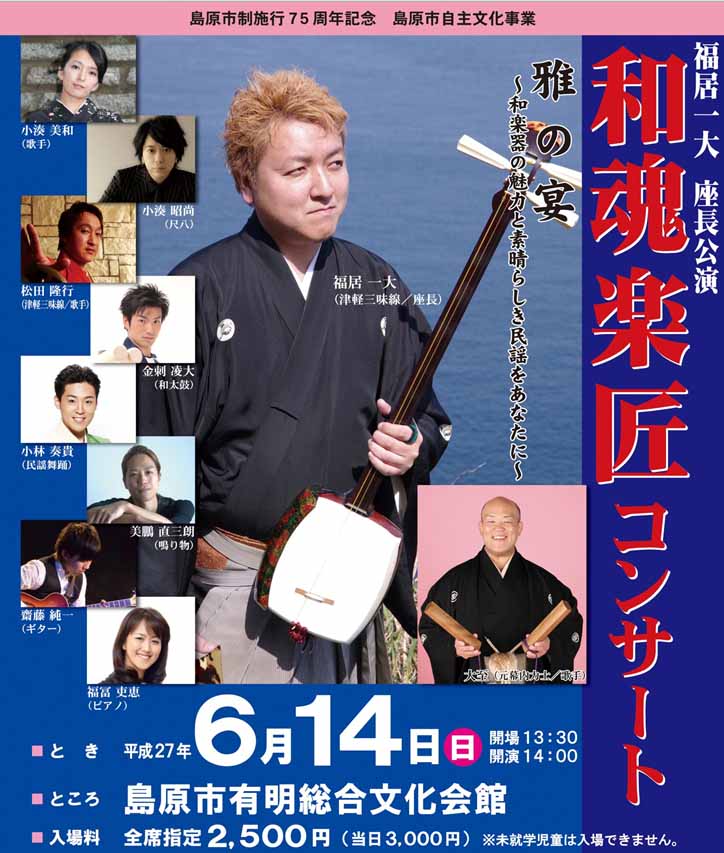| 福居一大座長公演「和魂楽匠/わこんがくしょう」コンサート ◎日時:6月14日(日)pm1:30開場/pm2:00開演 ◎場所:島原有明総合文化会館 ◎チケット:3000円(前売2500円) https://www.facebook.com/tsugarujyamisenfukuikazuhiro http://ameblo.jp/fukuikazuhiro/ |