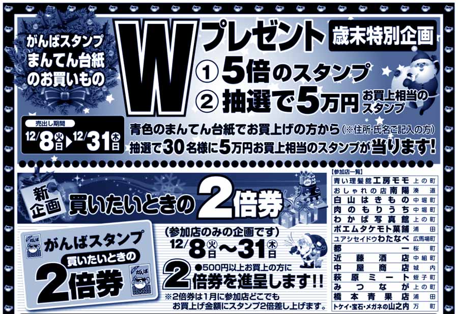| 参加店(14店)での、青色まんてん台紙でのお買い物は… ☆5倍スタンプシール! ☆抽選で5万円お買い上げ分スタンプシール! 期間:12/8(火)〜12/31(木) |
