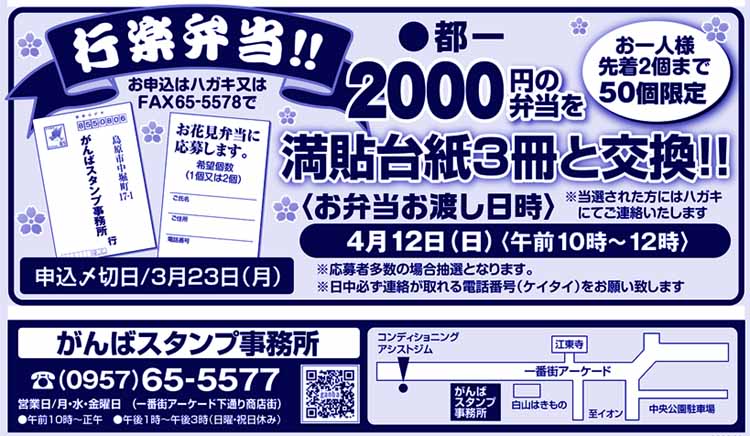 | ハガキまたはFAXでご応募ください。締め切り3/23 〒855-0806 長崎県島原市中堀町17-1 がんばスタンプ事務所あて FAX 0957-65-5578 行楽弁当:希望個数(1個or2個)/お名前/ご住所/電話番号(ケイタイ) 日中必ず連絡が取れる住所/電話番号(ケイタイ)をお願いします。不備の場合無効になります。 応募者多数の場合、抽選になります。当選者には、後日ハガキで連絡いたします。 |